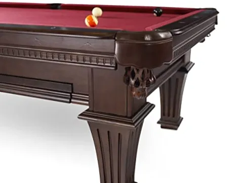 Enhance your game room with the Plank & Hide – Talbot Billiard Pool Table in Mocha by Empire USA. This premium pool table comes complete with a billiards kit and championship felt, ensuring an authentic playing experience. The table features real rubber bumpers, large tapered legs, and a recessed storage drawer for convenience. Crafted with hardwood quad beam internal bracing and genuine 1″ slate, this table is built for durability. Genuine leather shield pockets, 5.5″ all wood top rails, and a thick multi-layered engineered wood cabinet add to the table’s elegance and functionality. Elevate your game room with this stylish and high-quality pool table.