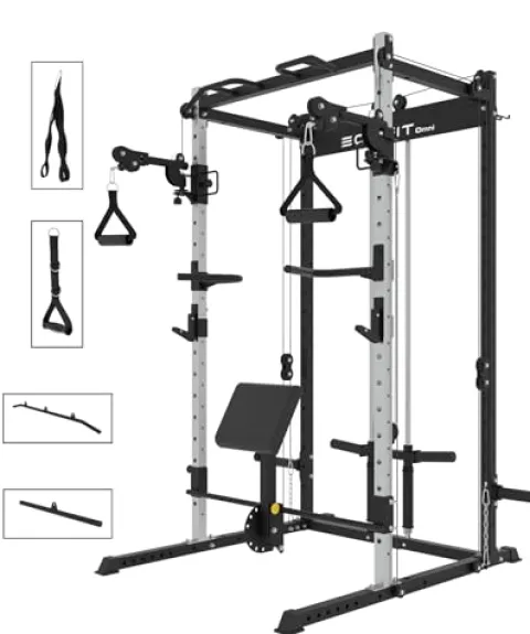 - Versatile Power Rack — The power rack with pulley system combines a strength training power cage, squat rack, pull up bar, cable crossover machine, lat pulldown machines and free motion arms that could provide full body workout and core muscle training.