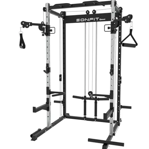 Enhance your strength training routine with the EonfitOmni Power Rack featuring a LAT Pulldown Cable Crossover Pulley System. This versatile home gym equipment offers a multifunctional power cage, squat rack, pull-up bar, cable crossover machine, and lat pulldown system, providing a comprehensive full-body workout and core muscle training. With 18 levels of height adjustment for j-hooks and safety bars, 3 levels for dip handles, and customizable cable pulley weights, you can personalize your workout experience. The sturdy construction of this power rack with its 14-gauge alloy steel frame ensures durability and reliability. Additionally, the included pad support attachment offers endless possibilities for various exercises, making it a perfect choice for a compact home gym setup.