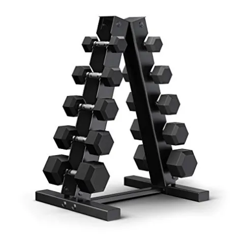 - SET CONTAINS – A pair of 5-pound, 10-pound, 15-pound, 20-pound, and 25-pound rubber hex dumbbells with a premium A-frame dumbbell rack for storage.