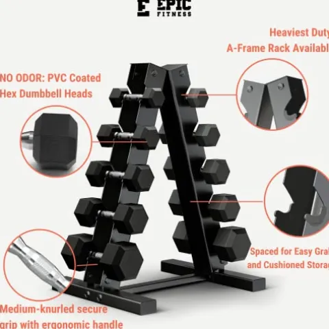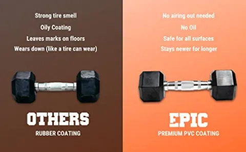 - SPECS – Hex shaped heads prevent rolling. The knurled handles provide ergonomic grip during use. Premium rubber coating. EPIC Fitness 1-Year Warranty Included.