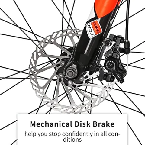 Conquer any trail with the EUROBIKE Full Suspension Mountain Bike. This 27.5-inch men’s bicycle in vibrant orange features 21 speeds for seamless gear changes, making uphill climbs, downhill rides, and accelerations smooth and efficient. With a blend of 3 gears on the front derailleur and 7 on the rear, this professional mountain bike ensures you power through any terrain effortlessly. Plus, with disc brakes and aluminum-alloy rims, this bike offers both style and performance for your outdoor adventures.