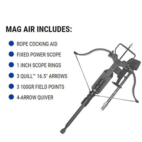 - ACCURACY – The Mag AIR archery crossbow features a fixed-powered, fog-proof scope that provides the brightest image possible in low-light hunting situations; the Rope Cocking aid creates comfortable cocking and decocking by reducing the felt draw weight