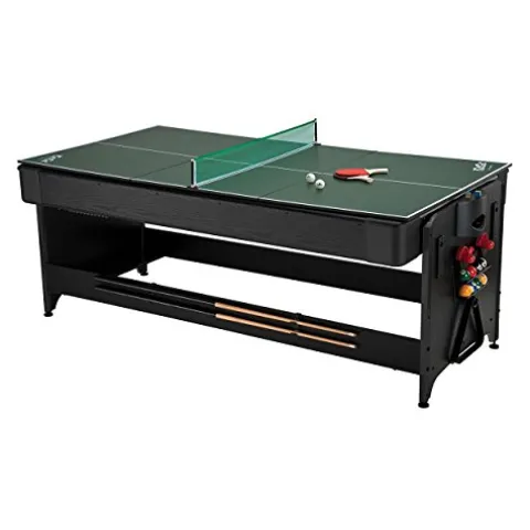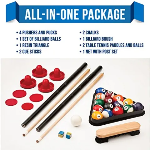 - Includes all of the accessories needed to play the games you love such as pool cues and billiard balls, hockey pucks and pushers, and table tennis paddles and net