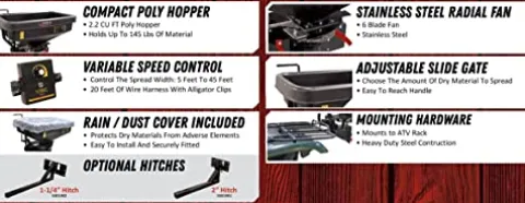 - Capacity – 2.2 cubic foot, compact-molded polymer hopper holds 145 lbs of material,