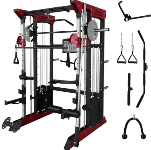 - Versatile All-In-One Smith Machine: This comprehensive home gym system combines a smith machine, pull-up station, and cable crossover machine for a full-body workout. Improve your exercise efficiency by avoiding the commute and fees associated with a gym membership. The machine features 18 adjustable heights, perfect for a variety of exercises like cable crossover flies and lat pull-downs.