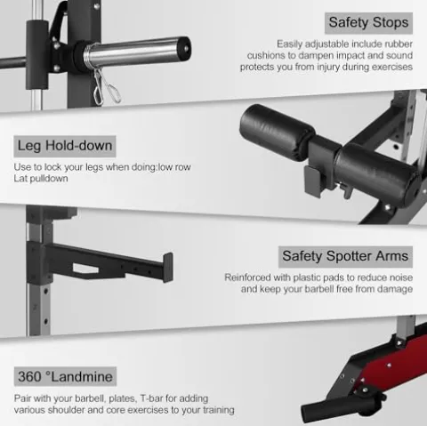 - Fully Equipped for Versatile Workouts: This home gym comes with multiple accessories, including a lat and cable bar, multi-grip pull-up bar, smith machine bar, standard Olympic bar, leg hold-down, landmine set, big footboard, and cable crossover attachment. It offers a wide range of exercises for your back, chest, arms, thighs, and abs, including deadlifts, rows, and pull-ups.