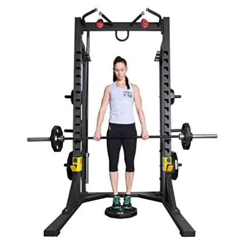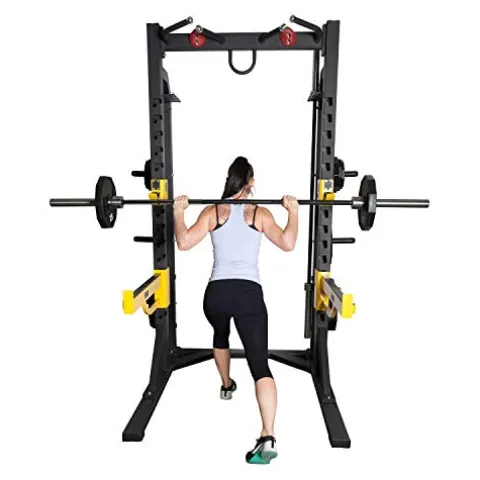 The Fitness First Half Power Rack in Black (F1RACK2) offers a versatile and safe workout solution for fitness enthusiasts. This free-standing double-sided racking system provides ample space and security for a variety of exercises. With 6 built-in Olympic weight plate storage holders, a large walk-in area for easy access, and a multi-grip pull-up station for wide grip options, this rack is designed for convenience and functionality. Ideal for exercise and fitness activities, this power rack is a valuable addition to any home gym setup.