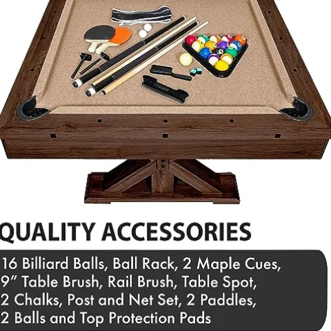 - 7 FT POOL TABLE ACCESSORIES INCLUDED: Premium grade 2.25 inch billiard balls, (2) 58 inch two-piece pool cue sticks, ball rack, 9 inch table brush, rail brush, 2 pieces of color matched chalk, 2 table tennis balls, 2 premium table tennis paddles, net and post set, and 6 top protection pads
