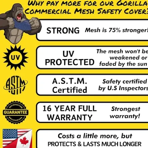 - 16 YEAR FULL WARRANTY! Gorilla Mesh Commercial Grade is the strongest, most durable safety cover available. Don’t be fooled by confusing “Pro-Rated” Warranties. Gorilla Mesh is backed by a 16 Year Full Warranty, with no proration!