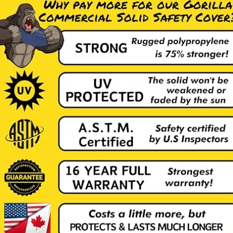 - 16 YEAR FULL WARRANTY! Gorilla Solid Commercial Grade is the strongest, most durable safety cover available. Don’t be fooled by confusing “Pro-Rated” Warranties. Gorilla Solid is backed by a 16 Year Full Warranty, with no proration!