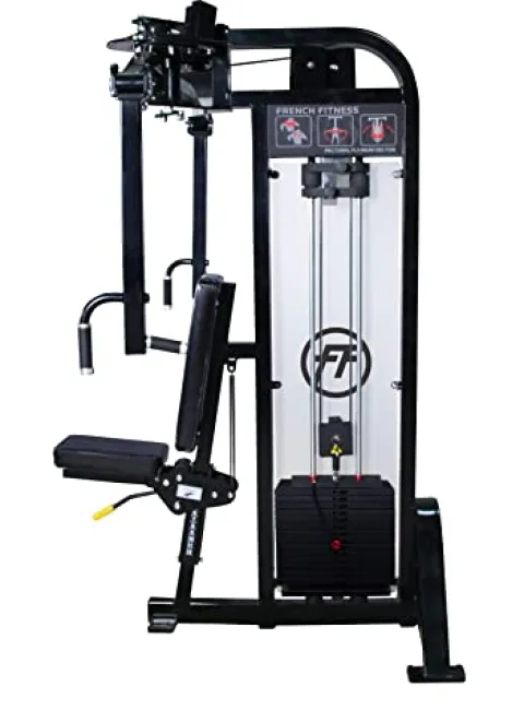 Elevate your strength training with the French Fitness Tahoe PEC Fly / Rear Delt machine, designed in sleek black to complement any fitness space. Engineered with a robust 3mm thick, 11-gauge ASTM A36 steel frame, it offers exceptional durability and stability. The fiberglass-impregnated nylon pulleys with sealed bearings ensure smooth and reliable movement, while the solid-steel weight plates, featuring self-lubricating bushings, offer a seamless workout experience. A magnetically locking weight selector pin, permanently tethered to the stack, ensures convenience and security, preventing any loss during intense sessions. This machine is a perfect blend of precision engineering and advanced functionality, making it an ideal choice for serious fitness enthusiasts.