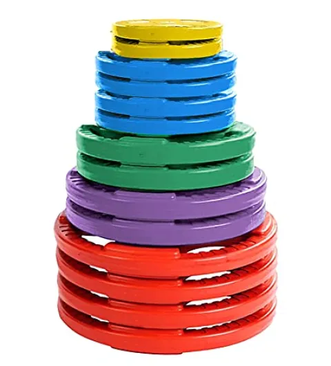 - The French Fitness Colored Rubber Grip Weight Plate features slotted grips for easy loading and offloading, rounded handles for comfortable grip, permanently molded weight numbers, a solid steel hub for precision fit, and color-coded plates for easy weight selection. It’s perfect for barbell and weight machine training, enhancing strength and muscle gain.