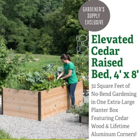 The Gardener’s Supply Company Elevated Cedar Raised Garden Bed offers a spacious 32 square feet of no-bend gardening, allowing you to cultivate vegetables and flowers effortlessly in your backyard. Crafted from naturally rot-resistant cedar and featuring rust-resistant aluminum corners, this durable planter box combines quality and longevity. Standing at 29 inches high, it eliminates the need to bend down, making gardening accessible and comfortable while saving your back from strain. With dimensions of 96″ L x 48″ W and a 10″ planting depth, it holds up to 685 quarts of potting mix, providing ample space for a diverse range of plants. Backed by a satisfaction guarantee, this elevated garden bed is a smart investment for any gardening enthusiast.