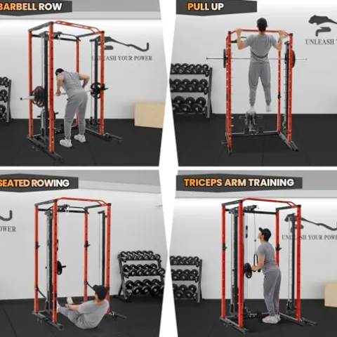 - Endless Training Options: Dive into a variety of exercises including squats, bench presses, pull-ups/chin-ups, dips, and more with our multifunctional power cage, enhancing your strength training safely and effectively. In addition, our power rack is equipped with SmithBar, which is very suitable for people who are new to strength training. It provides sufficient safety protection and is not easy to get injured.