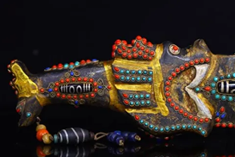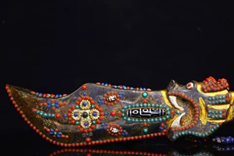 Enhance your space with the 17″ Tibetan Temple Collection Natural Meteorite Mosaic Gem Dzi Beads Beast Head Sword Shape Magic Weapon Amulet. This unique piece, crafted by Generic, combines mysticism and artistry, making it a captivating addition to any home or collection. The intricate design features a mosaic of dzi beads and bronze elements, culminating in a sword-shaped amulet that exudes ancient charm and spiritual significance. Ideal for those who appreciate the fusion of cultural heritage and decorative art, this amulet serves as both a striking focal point and a talismanic protector, bringing an aura of tranquility and strength to your environment.