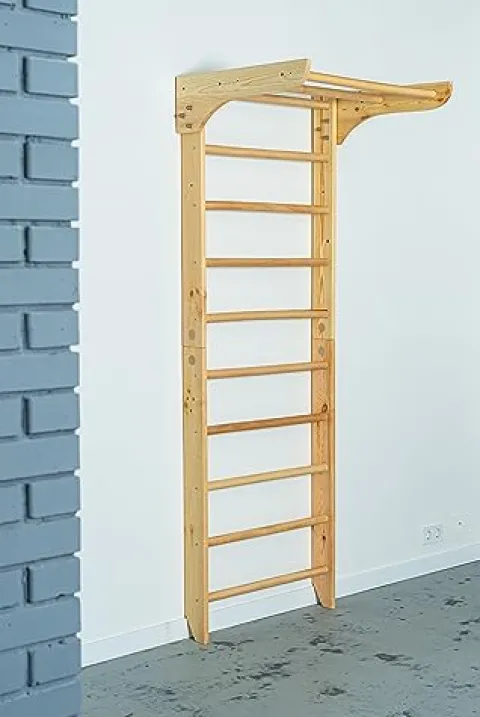 Enhance your fitness routine with the Wooden Wall Stall Bars for Kids and Adults – Swedish ladder with Pull-Up Bar. Crafted with superior beech and pine materials, this sturdy ladder ensures both reliability and safety. Suitable for various settings like home, school, yoga, and pilates studios, this compact design can hold up to 286 lbs, making it ideal for a range of activities from gymnastics to physical therapy. With a natural and environmentally friendly finish, this multipurpose ladder includes a pull-up bar, wall mounting kit, and detailed assembly instructions, catering to all your fitness needs in a convenient and versatile manner.