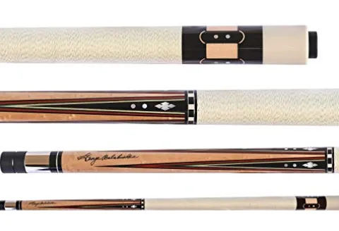 The Balabushka GBBS Era Cue pays homage to the iconic Burton Spain era of cues with its distinctive design elements. This cue, weighing 19 oz. with a 13mm shaft, showcases a beautiful combination of ebony, orange, green, and maple veneer colors. The ebony wood butt sleeve is adorned with straight-grain maple windows, separated by maple half circles and Mother-of-Pearl dots. The forearm points feature elegant Mother-of-Pearl dots above the traditional Balabushka notched diamond, making this cue a true collector’s piece for any billiards enthusiast.