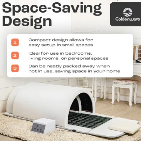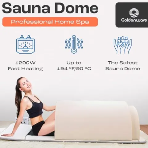 Experience the ultimate relaxation with the Golden Wave Far Infrared Sauna Dome. This professional home spa unit offers 360° body coverage, utilizing far-infrared technology for a comfortable and supportive sauna experience. With adjustable time and temperature settings, you can easily customize your session between 77°F-194°F for 20-60 minutes. The inclusion of Tourmaline and Germanium stones in the design helps release negative ions, aiding in the body’s detoxification process. Perfect for single-person use, this white sauna dome is a space-saving solution for bringing the benefits of a commercial sauna into the comfort of your home. Complete with essential accessories, including a digital control panel and insulated curtains, this Golden Wave sauna is your ticket to a rejuvenating spa experience anytime, anywhere.