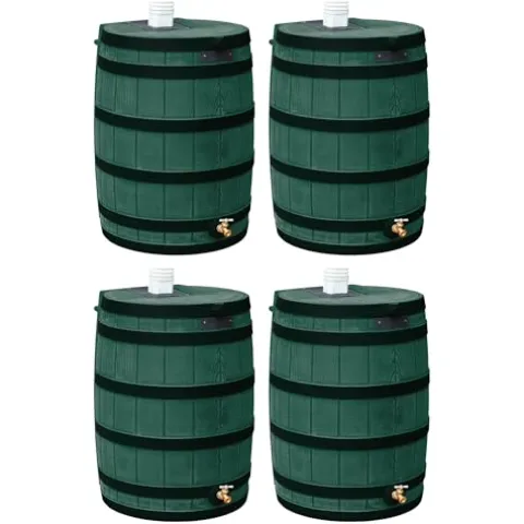 - Rain Barrel: Catch and store rainwater in this set of 4 50-gallon green wood rain barrels with darkened ribs