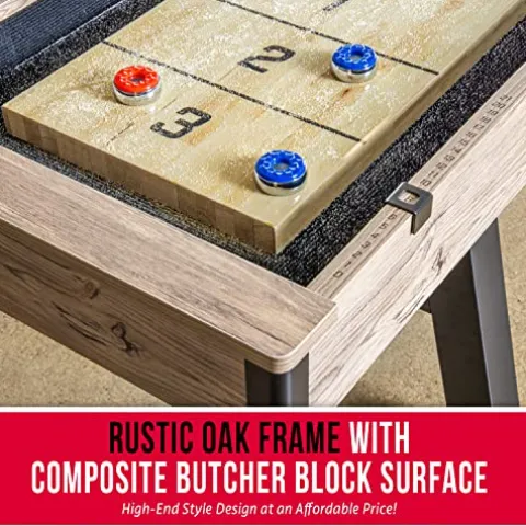 - MODERN DESIGN: Features a rustic oak finish frame, composite butcher block playing surface (8 ft x 14 in) and powder coated steel legs for a modern look that complements any room; Enjoy a high-end shuffleboard that will not break the bank