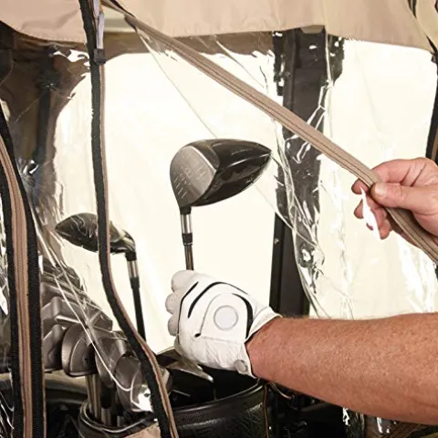 The Greenline Eevelle 300D Golf Cart Enclosure is designed to protect your EZ-GO custom drivable golf cart with its 4-sided enclosure made of heavy-duty 300D Durapel denier polyester fabric. Featuring DURAPEL yarn processing for improved performance and longevity, this waterproof and sun-protective cover safeguards your golf cart from sun, weather damage, and dirt. With super clear double polished vinyl windows, roll-up doors on each side, and XT Super duty double zippers with glove pulls, this enclosure offers easy access and visibility. The enclosure, fitting up to 2 passengers, comes with a clear rear panel for taillight visibility and includes a 3-year warranty along with a free executive carrying case for convenience.
