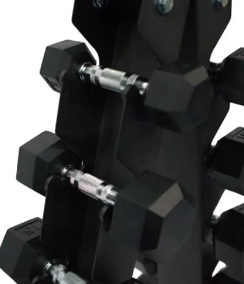 - A-FRAME WITH DUMBBELL SET – A pair of 25-pound, 30-pound, 35-pound, 40-pound, and 45-pound and 50-pound rubber hex dumbbells with black A-frame. Sturdy and durable construction ensures long-lasting performance. Six-tier design provides ample storage space for dumbbells