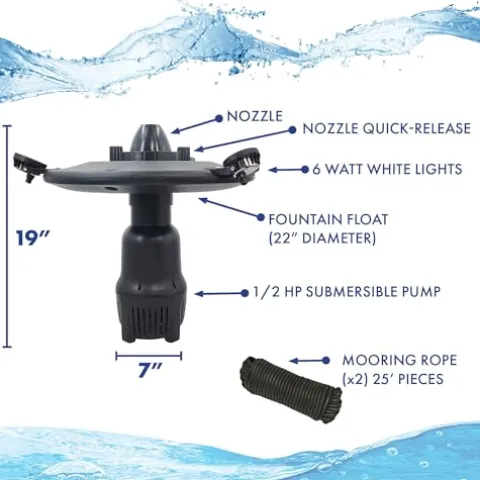 - Energy efficient 1/2 HP low-wattage pump with 100′ cord, one-piece 22″ float with quick release nozzle flange with 3 spray patterns, (2) 25′ pieces of mooring rope, (3) White Light Kit and all necessary fixtures