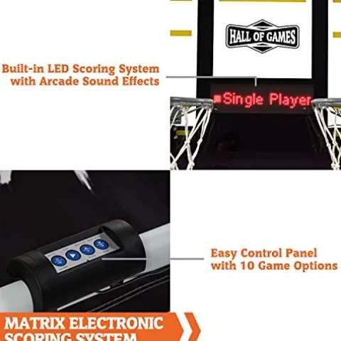 - ARCADE-STYLE GAME ACTION: The dynamic LED scoreboard with a plug-in power adaptor can display scores for 1 to 4 players and 10 different game modes with arcade sounds that can be switched on or off while playing, baskets are tracked with paddle sensors.