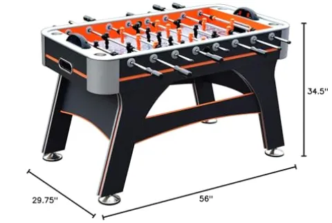 Elevate your game room with the Hathaway Trailblazer 56-in Competition Foosball Table, blending thrilling arcade soccer action with sleek design. Crafted from solid engineered wood and supported by oversized leg levelers, this table offers unmatched stability during intense matches. Its striking black and orange color scheme, enhanced by chrome accents, makes it a standout piece in any setting. Enjoy fair play with state-of-the-art electronic scoring and engaging sound effects that heighten the excitement. Measuring 56 inches in length, this table provides ample space for dynamic play, and comes with two 36-mm ABS foosballs. Plus, with a 180-day warranty, you can purchase with confidence, knowing your Trailblazer will arrive ready for action. Perfect for family game rooms or recreational spaces, this foosball table promises endless fun and competition.