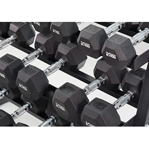 - Includes the rack and 2 each of the following dumbbells: 5,10,15,20,25,30,35,40,45,50 lbs dumbbells