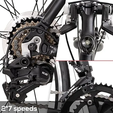 - 【Professional Shimano Drivetrain】Hiland road bike features 14 speed L-TWOO derailleurs and SHIMANO Shifters, gives diverse riding experience and also ensures total control in every situation, like in gravel, city road or other tough terrain. You can glide over most obstacles without losing speed or getting shaken around too much.