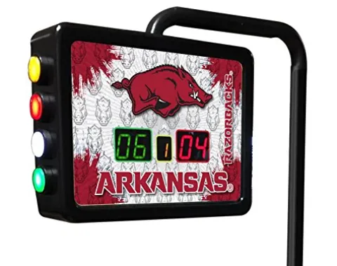Elevate your game room with the Holland Bar Stool Co. Arkansas Electronic Shuffleboard Scoring Unit. This officially licensed unit boasts vibrant, digitally printed full-color graphics that proudly display your team spirit. The intuitive color-coded push button counter allows for effortless two-player scoring and game tracking, making every match fun and competitive. Its compact yet functional design features a scoring unit sized at 15 inches wide by 11.5 inches high, with a support that extends 51 inches tall, perfectly positioning the unit over the playfield. Easily adaptable for various games, the mounting plate attaches directly to the game’s side, ensuring stability and convenience. Complete with four shims for custom adjustments, this scoring unit is the perfect addition for avid shuffleboard enthusiasts and dedicated sports fans.
