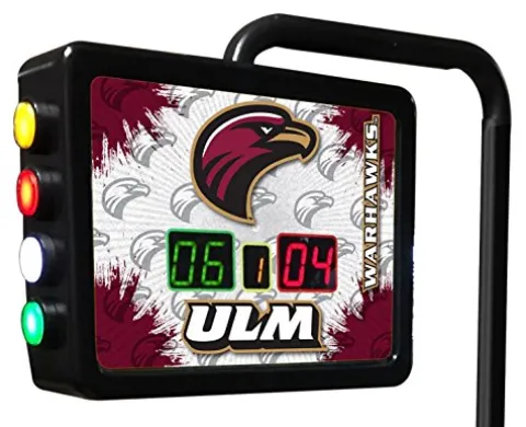 Enhance your shuffleboard game experience with the Holland Bar Stool Co. Louisiana-Monroe Electronic Shuffleboard Scoring Unit, featuring officially licensed, digitally printed full-color graphics. This innovative scoring unit boasts a color-coded push-button counter for easy 2-player scoring and game tracking. Measuring at 15″(W) x 11 1/2″(H) x 3 1/2″(D), the unit is supported by a 51″ tall stand that extends over the playfield for convenient visibility. Versatile and adaptable, this scoring unit can be mounted to almost any game with its 5 3/4″(H) x 3″(W) x 3/8″(D) mounting plate. Elevate your shuffleboard game nights with this top-of-the-line scoring unit.