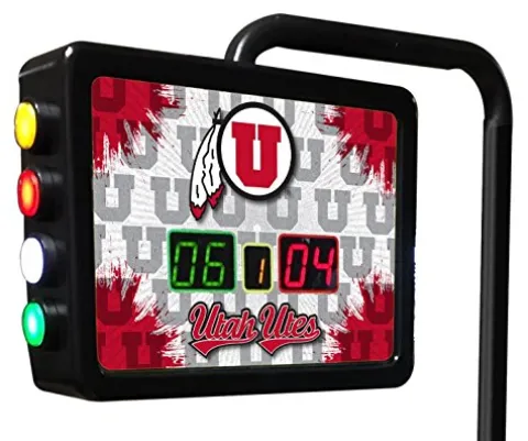 Elevate your shuffleboard experience with the Holland Bar Stool Co. Utah Electronic Shuffleboard Scoring Unit. This officially licensed unit features vibrant, digitally printed full-color graphics that add flair to any game room. Its user-friendly design includes a color-coded, push-button counter to keep track of two-player scores and game counters effortlessly. Measuring 15″ x 11 1/2″ x 3 1/2″, the scoring unit is supported by a 51″ tall stand, extending approximately one foot over the playfield for optimal visibility. Adaptable to almost any game, it comes with a convenient mounting plate and shims for easy installation. Enhance your shuffleboard setup with this reliable and stylish scoring solution.