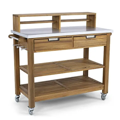 The Homestyles Maho Potting Bench combines functionality with style, making it an essential addition to any gardening space. Crafted from solid, water-resistant acacia wood and finished with a golden teak hue, this bench is both durable and attractive. The galvanized steel top resists rust and corrosion, ensuring longevity in outdoor conditions. With ample storage options, including two drawers, two slatted shelves, and an upper hutch, you’ll have plenty of room for gloves and tools. The stainless steel towel bars, equipped with hooks, add further convenience to your gardening tasks. Easily movable on stainless steel casters with locking capabilities, this potting bench is as versatile as it is practical. Some assembly is required, but the straightforward instructions make setup a breeze.