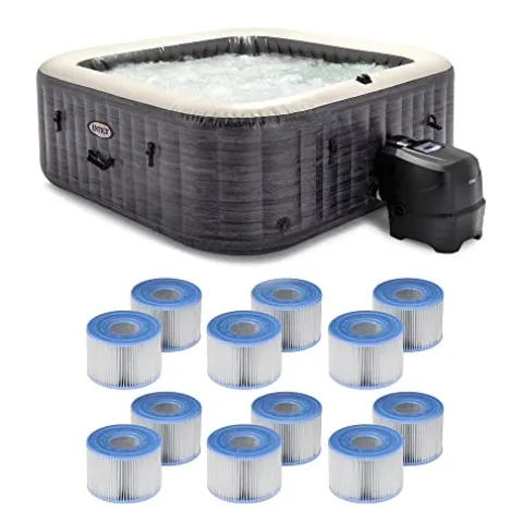 Experience ultimate relaxation with the Intex PureSpa Plus Greystone Inflatable Square Outdoor Hot Tub Spa. This portable spa comfortably fits up to 6 people and comes bundled with a set of 12 Type S1 Easy Set Spa Filter Replacement Cartridges for continuous clean and clear water. Enjoy the soothing 140 high-powered jets and customize the water temperature up to 104 degrees Fahrenheit for a perfect soak every time. With a built-in hard water treatment and saltwater sanitation system, your spa experience is not only relaxing but also gentle on your skin and spa equipment. The durable Dacron paper construction of the filters ensures top-notch filtration performance, making maintenance a breeze. Relax and unwind in style with this luxurious hot tub spa.