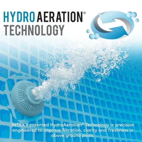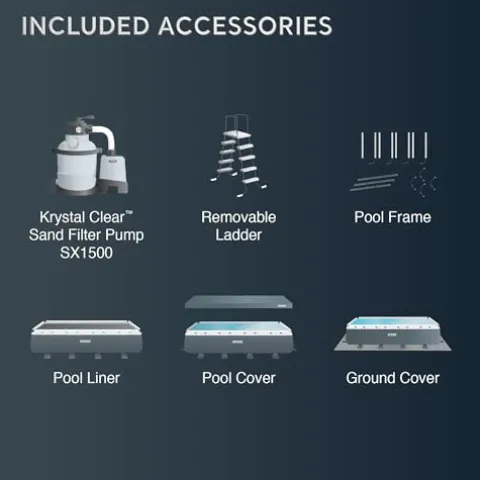 - Includes: 2,100 GPH sand filter pump, debris cover for pool cleanliness, protective ladder with interior side barrier, and a ground cloth