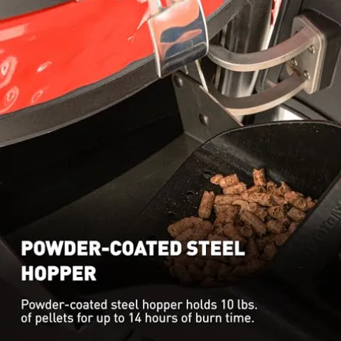 - Powder-coated steel pellet hopper holds up to 10 lbs. of wood pellets for up to 14 hours of burn time at smoking temperatures, included pellet agitators in hopper significantly reduce pellet bridging and jams