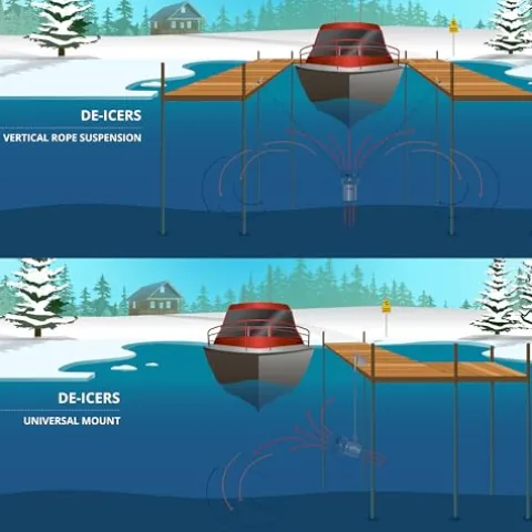 - High Performance: This dock deicer bubbler is specifically designed with a high efficiency motor and propeller with 1750 rpm that creates a directional flow of water. This pushes warm bottom water to the surface and provides an ice-free area of protection around your boat, dock, pier, or other in-water property.