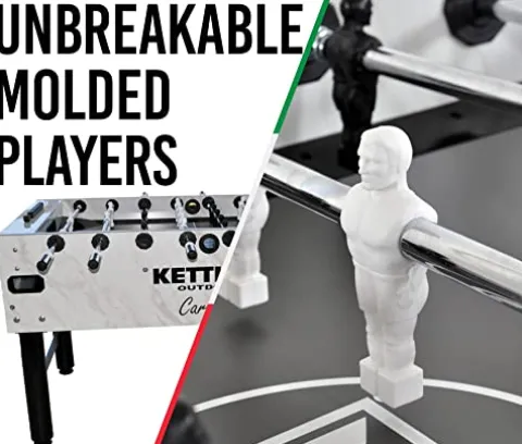 - MADE IN ITALY – This outdoor foosball table features a tournament-style cabinet with a look that mirrors true Italian Carrara marble plus powder-coated steel legs. Assembled dimensions: 58 L x 30 W x 34 H inches/ Weight: 120 pounds.