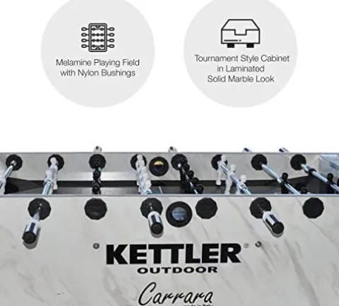 Experience the authentic Italian craftsmanship with the KETTLER Carrara Outdoor Foosball Table. This tournament-style table boasts a sleek design reminiscent of Carrara marble, with durable powder-coated steel legs. The steel telescopic rods feature anti-rust chromium plating for smooth maneuvering, while the elongated handles with rubber inlay ensure a comfortable grip for perfect shots. The foosball players are unbreakable and molded onto the rods, with a 360-degree rotating goalie for added excitement. Enjoy the melamine playing field, side and corner rails, ball pockets for easy retrieval, and nylon bushings for high-speed action. Complete with five resin balls, five cork balls, and a premium storage cover, this outdoor foosball table is ready for endless fun with family and friends.