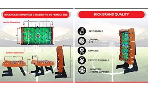 Experience the thrill of competitive foosball right in the comfort of your own home with the KICK Majesty 55″ Folding Foosball Table in Brown. This full-size table, measuring 55″ L x 30″ W x 36″ H, is designed for durability and convenience. It comes complete with both Counter Balanced Men Set and Uniformed Men Set, ensuring a balanced and fair game every time. Plus, with a lifetime warranty offered exclusively on new tables purchased from KICK, you can enjoy endless hours of entertainment with peace of mind. Elevate your game room with this high-quality foosball table from KICK.