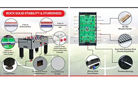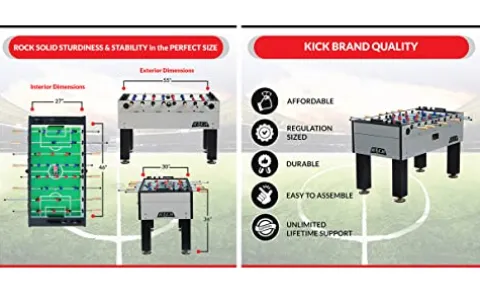 The KICK Titan 55″ Tournament Foosball Table in sleek gray is the ultimate addition to any game room, combining durability with elegance for a superior playing experience. With dimensions of 55″ L x 30″ W x 36″ H, it offers ample space for competitive play, while its counter-balanced and uniformed men sets ensure a smooth and engaging match every time. Engineered for longevity, this table promises countless hours of fun backed by an unlimited lifetime warranty, making it a reliable choice for foosball enthusiasts who demand quality and style.