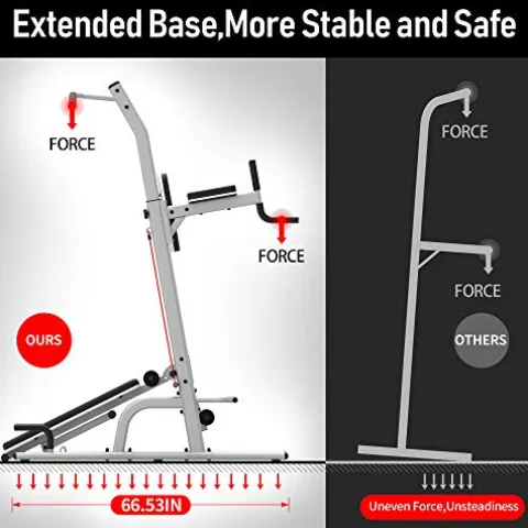 - 【Solid Build Workout Tower】Heavy duty powder coated steel tube frame and non-slip foot sets make the stability,Customized design with back cushion and elbow pads,Gym-level construction with foam rollers for real comfort,136cm extended curved base with 4 powerful sunction caps and multiple stable anti-skid cross bar,all these designs of this home gym equipment highlight the stability and safety to avoid any wobble.