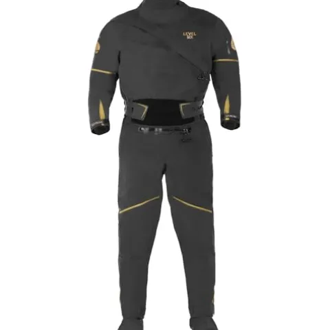 The Level Six Odin Black Out Dry Suit is engineered for those who demand exceptional performance and comfort in challenging conditions. This medium-sized dry suit, dressed in a sleek black, features British latex wrist and neck gaskets with adjustable protectors to seal out water effectively. Stay connected to your essentials with the fleece-lined pocket, safeguarded by an aqua seal zipper. The strategically placed front chest entry and relief zippers enhance convenience without compromising on waterproofing. Made from breathable fabric with reinforced knees, this suit is designed to keep you dry, while its articulated spine, knees, and elbows ensure a full range of motion. Perfect for water enthusiasts who refuse to let weather dictate their adventures.