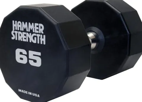 The Hammer Strength 12 Sided Urethane Dumbbell, crafted by Life Fitness, offers a robust and reliable solution for your strength training needs. Weighing in at 65 pounds, this black dumbbell features a unique 12-sided anti-roll head design, ensuring stability and safety during intense workouts. The handle, pressed and welded securely to the head, is flared and hard chrome plated, providing an optimal grip with a 1-3/8″ diameter for enhanced comfort and control. Perfect for both home and commercial gyms, this single dumbbell exemplifies durability and performance, making it an essential addition to your fitness routine. Please note, if a pair is desired, select a quantity of two.