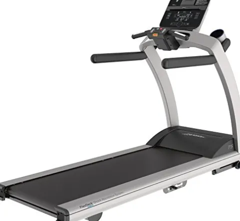 Experience the ultimate in home fitness with the Life Fitness T5 Treadmill with Track Connect Console. This treadmill, in a sleek gray color, features the patented FlexDeck Shock Absorption System, reducing stress on knees and joints for a safer workout. The spacious 60” x 22” running surface allows for long strides, while the Energy Saver technology minimizes energy consumption. With personalized Quick Start options and Bluetooth connectivity for syncing with fitness apps, this treadmill offers a connected workout experience. The dual-zone console design provides both entertainment and workout control at your fingertips. Included components ensure you have everything you need for a complete fitness solution.