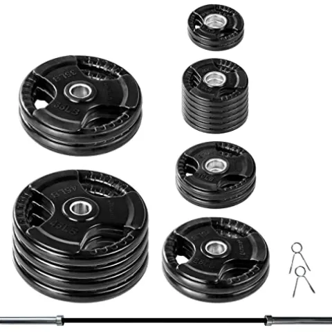 The Lifeline 400lb. Rubber Coated Pro Olympic Grip Weight Plate Set is a professional-grade set that includes a variety of weight plates, an Olympic bar, and collars. Featuring a durable rubber coating and secure stainless steel inserts, this set is designed for safe and easy use. The multiple open grip holes and built-in grip holes allow for versatile workouts, while meeting IWF standards for competition use ensures top-notch quality and consistency in training. The sleek black color adds a modern touch to your home gym or professional training facility.