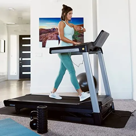 Enhance your home workout experience with the LifeSpan Fitness TR5500iM Home Treadmill. Featuring a 10″ full-color touchscreen and phone mirroring ability, this treadmill in black offers endless entertainment options with Bluetooth speakers and YouTube screencasting. With over 50 programs, fitness tests, and training programs, along with a spacious running surface and 8 compression shocks for joint comfort, the TR5500iM caters to all training styles. Powered by a robust 4.0 HP motor, this treadmill ensures a smooth and powerful workout every time. Elevate your fitness routine with the TR5500iM treadmill from LifeSpan.